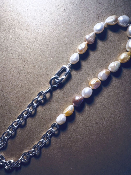 Mi-chaîne mi-perles, un collier qui alterne force et douceur. Perles baroques de culture aux teintes naturelles mêlées à une chaîne argentée massive avec des maillons de 7,5mm. Collision entre terre brute et mer nacrée.